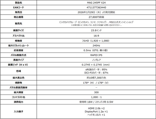 この度、エムエスアイコンピュータージャパン株式会社は2026年1月29日(木)より、ゲーミングモニターの新モデルをビックカメラグループ(ビックカメラ、コジマ、ソフマップ)、MSI公式オンラインショップにて発売いたします。高いゲーミング性能とコストパフォーマンスに優れた『MAG』シリーズから、240Hzの高リフレッシュレートと応答速度0.5ms(GTG、最小値)を実現するRAPID IPSパネルを採用し、よりゲームを楽しめるAIビジョン等のゲーマー向け機能、高性能スタンドによる柔軟な設置にも対応した「MAG 245PF X24」が新たにラインナップに加わります。