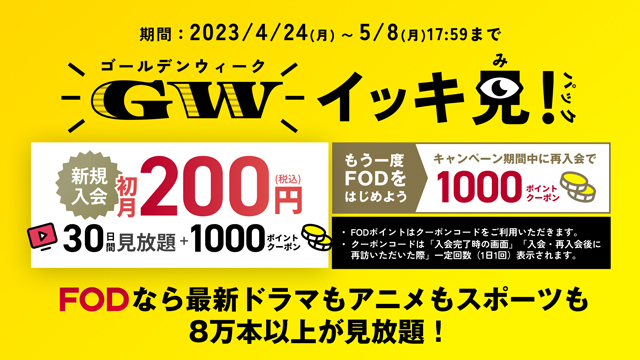 フジテレビが運営する動画配信サービス「FOD」は、2023年4月24日(月) ~2023年5月8日(月)17時59分のゴールデンウィーク期間にあわせ、「ゴールデンウィーク イッキ見!パック」キャンペーンを開催します。