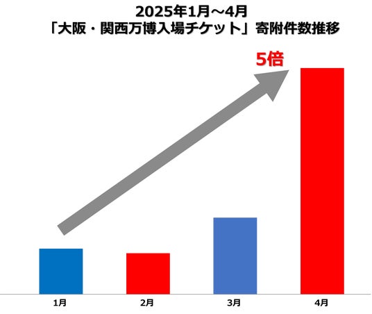 実際に「大阪・関西万博入場チケット」への寄附件数推移を見てみると、1月から4月では約5倍にも増加しており、その需要の高さが伺えます。