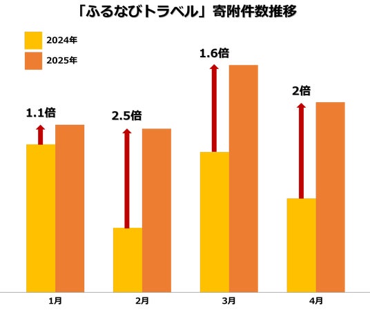 「ふるなびトラベル」への寄附増加に加え、「大阪・関西万博入場チケット」への寄附も年始から大きく伸び、旅行先としての関西エリアへの注目の高さがうかがえます。