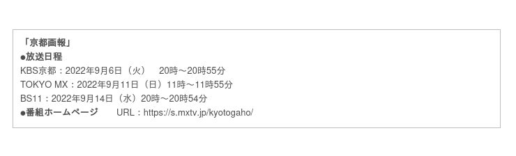 ■放映番組:BS11「京都浪漫 悠久の物語」・BS11「和モダン時間(タイムス)~着物でニッポンをさんぽしよう!~」・BS11「京都画報」