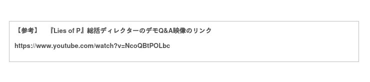 <最新トレーラー「Lies of P - 発売日発表トレーラー」URL>