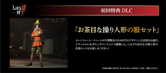 初回購入特典として、ゲーム内で使用できる衣装DLC「お茶目な操り人形の服セット」が付属いたします。