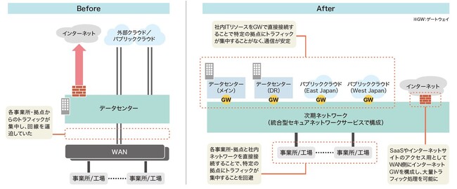 無添加化粧品や健康食品の研究開発・製造・販売を手掛けるファンケルでは、各拠点のインターネット接続がデータセンターを経由する構成となっており、トラフィックが集中して回線が逼迫するという課題がありました。さらにコロナ禍での在宅勤務やWeb会議などによる社内業務が増加する中、お客様との新しいオンラインコミュニケーションを安定して行うためには、インフラの強化が必須でした。
