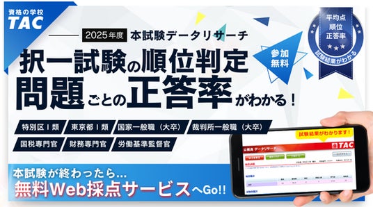 公務員、日商簿記検定、税理士、公認会計士などの資格取得に向けた教育サービスを展開しているTAC株式会社(東京都千代田区、代表取締役社長:多田敏男)は、4/20(日)実施の「東京都I類B[行政/一般方式]採用試験」と「特別区I類[事務]採用試験」の専門記述試験・論文試験の模範解答を本試験データリサーチ登録者限定で、4/25(金)17時よりホームページで公開いたします。