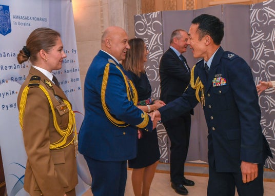 ウクライナ赴任中に開かれたレセプションにおいて、ルーマニア武官と握手をする1等空佐(右)。