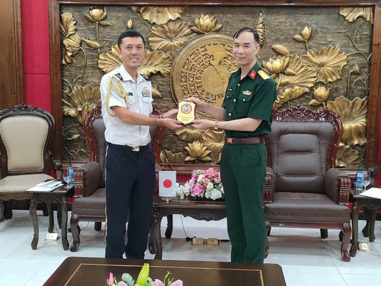 ベトナムを離任する際、国防省の国防国際関係研究所所長(右)を表敬訪問する1等陸佐。