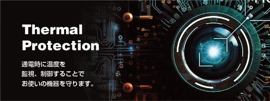 過充電・過放電・過電流防止機能および短絡保護機能と温度検知機能の5つの保護機能を備えた安心の回路設計です。さらにThermal Protectionを搭載し、通電時に温度を監視・制御することで、お使いの機器を守ります。