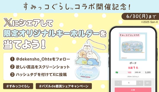 アプリ内の懸賞応募ページに掲載されている「すみっコぐらし」グッズから欲しい賞品のスクリーンショットを撮影し、指定のハッシュタグをつけてXに投稿した方の中から抽選でコラボ限定「すみっコぐらし」オリジナルグッズをプレゼント!