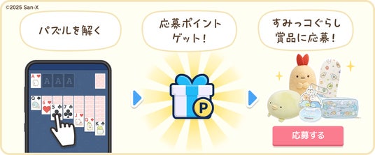 各アプリ内でパズルをクリアすると、応募ポイントを獲得できます。集めたポイントで「すみっコぐらし」グッズが当たる懸賞に応募できます。