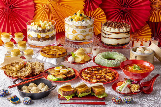 「チャイニーズ&ピーチ・メロンスイーツフェア」には、よだれ鶏、中華クラゲの和え物、ピータン豆腐などの前菜にはじまり、海老と白身魚のチリソース、四川麻婆豆腐、酸味が効いたスーラータンといった中華料理の定番メニューに加え、サクサク感とスパイシーな香り、手のひらサイズの大きなチャイニーズフライドチキン、うまみが凝縮された肉あんを厚めの皮で包んで香ばしく焼き上げた焼き小籠包、柔らかく煮込んだ豚の角煮(トンポーロー)を蒸しパンで挟んだ割包(カーポウ)など、チャイニーズフードがビュッフェに登場いたします。