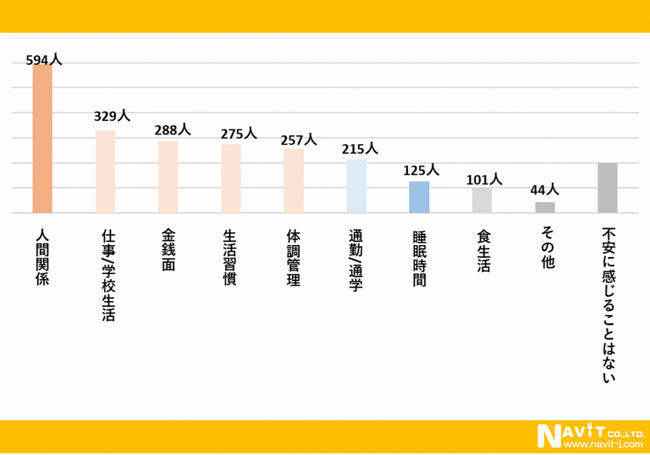 「あなたが新生活を始めるにあたって不安なことは何ですか?」という質問を複数選択可能で行ったところ、「人間関係」が594人、「仕事/学校生活」が329人、「金銭面」が288人という順になりました。