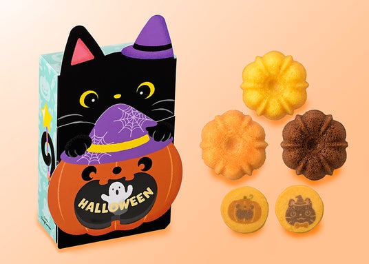 特長:ハロウィンのシンボル「黒ねこ」をモチーフにした立体的なボックスに、お花形のフルーリマドレーヌと、黒ねことかぼちゃをそれぞれプリントしたクッキーをアソートしました。フルーリマドレーヌ(バター、ショコラ)のフィルムは黒ねこやおばけがデザインされた4種類で、ランダムに入っています。ボックスデザインは、黒ねこの表情別に4種類。黒ねこが持っているかぼちゃのフタを開けると、かわいい表情が現れる仕掛け付きです。