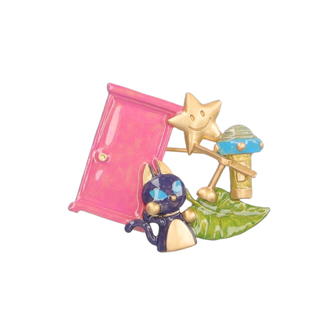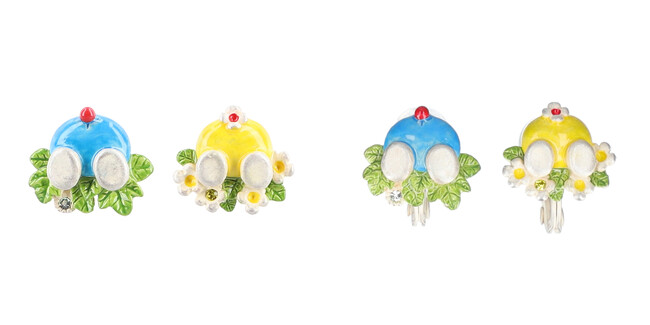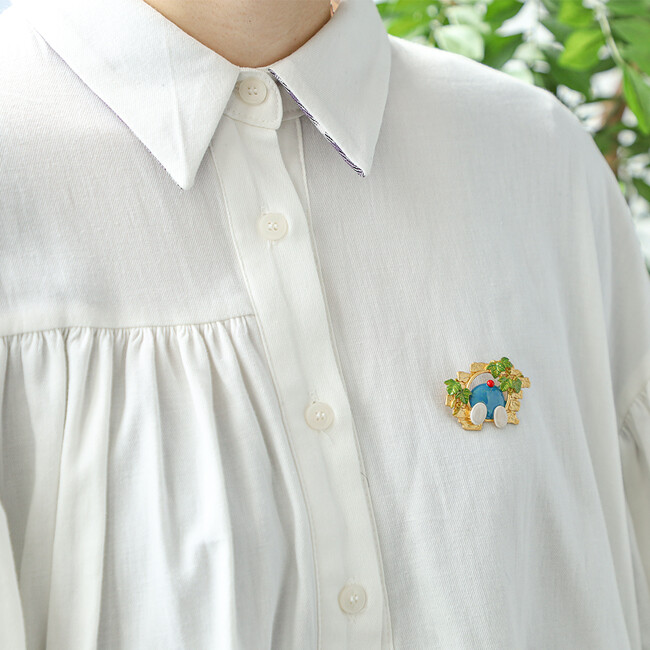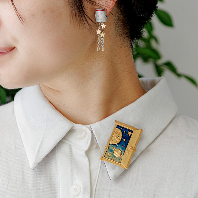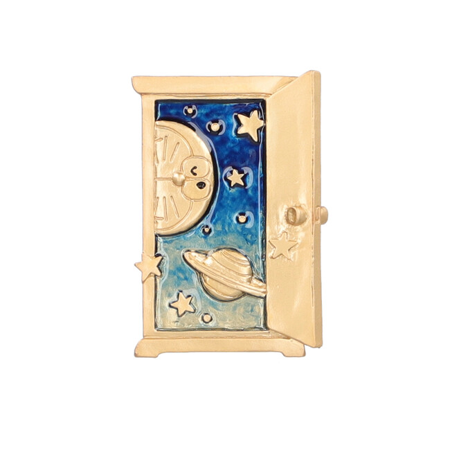 ドラえもんとドラミちゃんが揃ってかくれんぼしているようなピアスとイヤリング「きょうだいかくれんぼ」や、ひみつ道具の“スモールライト“、”宇宙救命ボート“をモチーフにしたアシンメトリーなデザインのピアス、”どこでもドア“、”通りぬけフープ“をモチーフにしたブローチなど、どのお話に登場したひみつ道具なのか、思わず作品を読み返してみたくなるような全8種が揃います。