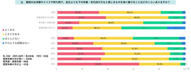 実際よりも若い感覚で生活していると、身に着けるものが自然と若くなるようです。実年齢より感覚が若い人のほぼ9割が、そのようなことがあると回答。30代になっても20代の頃に買った服を違和感なく着ていたり、50代になっても選ぶ雑誌は40代向けとされているものだったり、身に覚えのある人も多いのではないでしょうか。