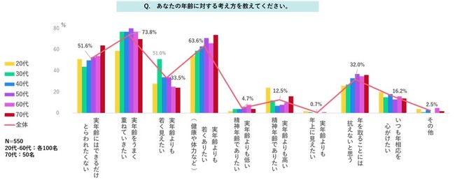 実年齢に対する考え方で7割と最も多かったのは、「実年齢をうまく重ねていきたい」でした。「実年齢にはできるだけとらわれたくない」も5割と、実年齢を受け入れつつも気には病まないように付き合っていくことが主流であるようです。