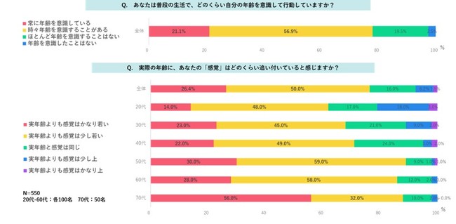 回答者の約8割が、普段から年齢を意識して行動しているようです。ですが、回答者の同じく8割が、生活するなかで実年齢よりも「感覚」は若いと感じていました。その割合は年代とともに上がり、特に50代以上ではほぼ9割とより顕著。一方、20代では「感覚」の方が実年齢よりも上だと思う人が2割程度存在しました。