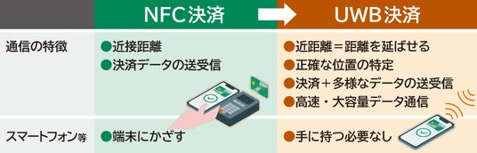 UWB通信とは、Wi-Fi等と同程度の距離で通信が可能な次世代の無線通信技術です。店舗の決済端末にかざすNFC※3やスマートフォン等で画面の読み取りが必要な二次元コード決済とは異なり、数十メートルの距離があってもデバイスの正確な位置の特定や高速通信が可能であることから、決済や要望の伝達におけるユーザーおよび店舗の課題を解決する新たな店舗内体験の実現手段として注目されています。