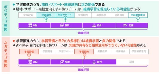 一方で、学習促進のために実施している施策(例えば、学習習慣や目的)が、必ずしも組織の変化につながっていない可能性があることも分かりました。「個人の学び」を「組織学習」に生かし、「組織成果」につなげるためには、組織が「個人の学び」を推進しながら、学びの成果を共有したり、活用したり場を設けるなどの施策を行うことで、組織内にラーニングカルチャー(学びの文化)を醸成していくことが重要だと考えられます。