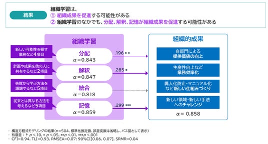 調査の結果、「組織学習」の中でも「情報分配」「情報解釈」「情報記憶」が特に「組織成果」に大きく関連していることが分かりました*1。知識を共有し、活用し、組織内に蓄積することで、業績向上や新しいビジネス創出につながる可能性が示唆されました。