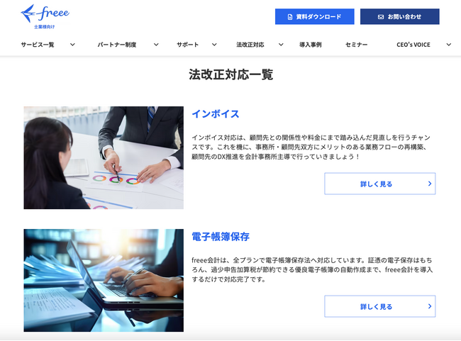 freeeのプロダクトやパートナー制度、法改正対応に関する最新の情報やCEO佐々木大輔から士業の方へ向けたメッセージ動画などを公開しています。