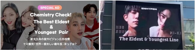 2023年6月14日(水)から6月27日(火)までの期間で開催した、「ケミ爆発!世界一愛おしい最年長・末っ子は?」の投票において1位に選ばれたENHYPENのNI-KIさん、HEESEUNGさんの応援広告が、新大久保のK-PLAZA 1号館の屋外ビジョンで上映中です。