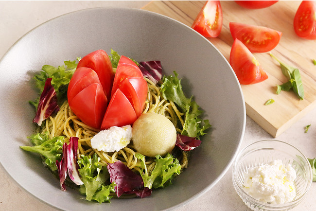 トマトをまるごと使用した、色鮮やかで爽やかな大葉ジェノベーゼ。 酸味と爽やかな風味のカッテージチーズも好相性。 ひんやり冷たい大葉のシャーベットドレッシングを溶かし混ぜながらお召し上がりください。