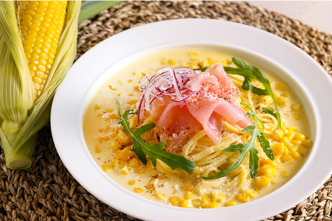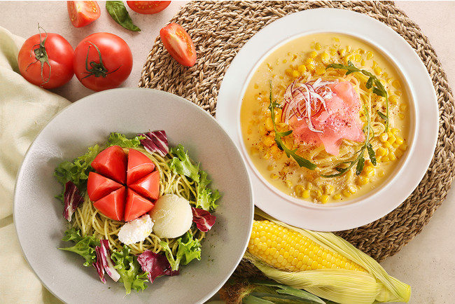 暑い日にもさっぱりと食べられる、たっぷりのとうもろこしを使用したクリームパスタと、まるごとトマトを使用した爽やかな大葉ジェノベーゼパスタ。