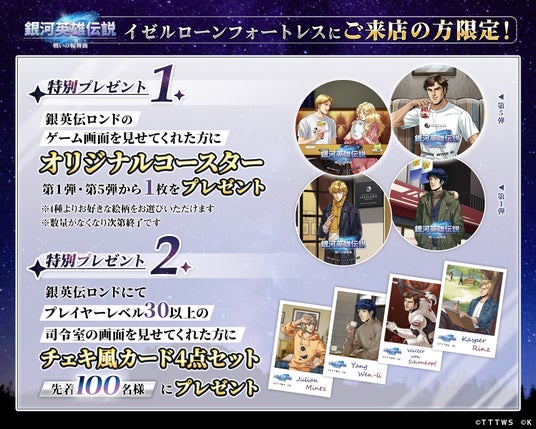 イゼルローンフォートレスにて、銀英伝ロンドのゲーム画面を見せることで、限定グッズが貰えるキャンペーンを開催します。本作のイラストを使用したグッズとなりますので、ご興味がある方はぜひイゼルローンフォートレスへ足をお運びください。