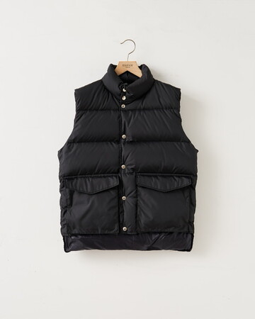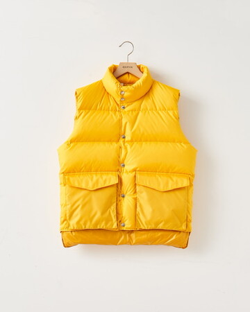 ダウンベストはラウンドした裾、ポケットのデザイン、縫い目のないネックディテールは70‘sオマージュのレトロデザインになります。