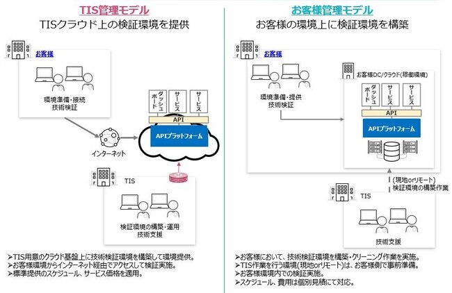 そこでTISは、APIの開発・管理をお試しいただくことで本番導入の足掛かりとなるAPIプラットフォーム技術検証サービスを提供してきました。そして今回、検証作業における事前準備を極力減らしたい、新たな外部接続などは行わず既存のアセットを活用したいといったご要望にお応えし、お客様の既存環境にTISの推奨する検証環境を構築できるお客様管理モデルを追加いたします。本サービスによりお客様は検証で必要なリソースやコストを抑えることが可能となります。