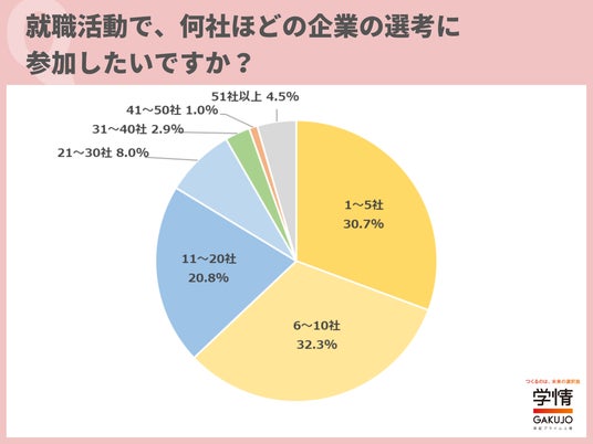 株式会社学情(本社:東京都中央区)は、2026年3月卒業(修了)予定の大学生・大学院生を対象に、インターネットアンケートを実施。今回は、「プレエントリー・選考参加」について調査しました。就職活動でプレエントリーしたい企業数は、「10社以下」の回答が6割を超えました。セミナーに参加したい企業数も、「10社以下」の回答が半数以上となっています。「しっかりと企業研究をした上で選考に参加するため、増やしすぎないようにしたい」「プレエントリーする企業には、真剣に向き合いたい」などの声が寄せられました。選考に参加したい企業数は、「10社以下」の回答が6割を超える結果に。「10社以下」の回答は前年(2025年卒学生対象調査)よりも7.1ポイント増加しており、選考に参加する企業を絞り込む傾向がより顕著になっていることが分かります。「1社1社、高い熱意をもって選考に参加したい」「内定をもらったら入社したい企業に絞って選考に参加したい」といった声が寄せられました。
