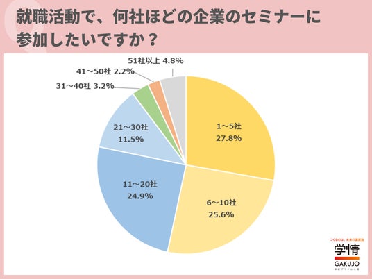 就職活動でセミナーに参加したい企業数は、「1~5社」が27.8%で最多。次いで、「6~10社」25.6%、「11~20社」24.9%が続きます。「10社以下」の回答は半数を超えました。「複数のセミナーに参加して、情報収集を十分に行いたい」「志望業界が決まっているので、その業界の複数の企業に参加する予定」「様々な業界のセミナーに参加して得られた知見は、社会人になってからも活きると思う」などの声が寄せられています。