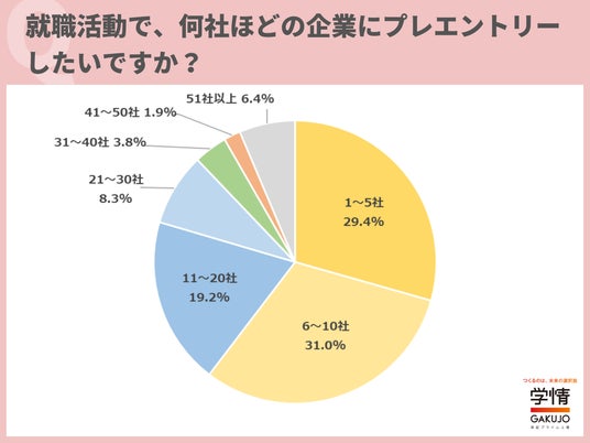 就職活動でプレエントリーしたい企業数は、「6~10社」が31.0%で最多。次いで、「1~5社」29.4%、「11~20社」19.2%が続きます。「10社以下」の回答は6割を超えました。「しっかりと企業研究をした上で選考に参加するため、増やしすぎないようにしたい」「プレエントリーする企業には、真剣に向き合いたい」「まずは合同企業セミナーに参加し、何社か比較をした上で会社説明会や選考に参加する企業を決めたい」「プレエントリー数を増やしすぎると、スケジュール管理が難しくなると思う」といった声が上がりました。