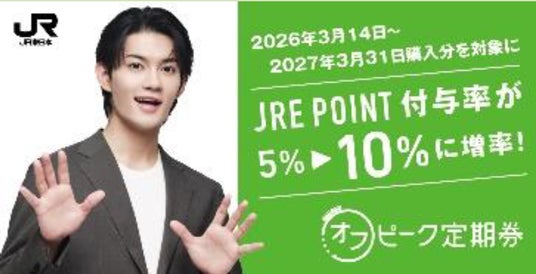 ○「オフピーク定期券」は、JR区間の購入金額に対して「5%」分のJRE POINTを付与しておりますが、2026年3月14日(土)購入分から、期間限定で「10%」分の付与に増率します。