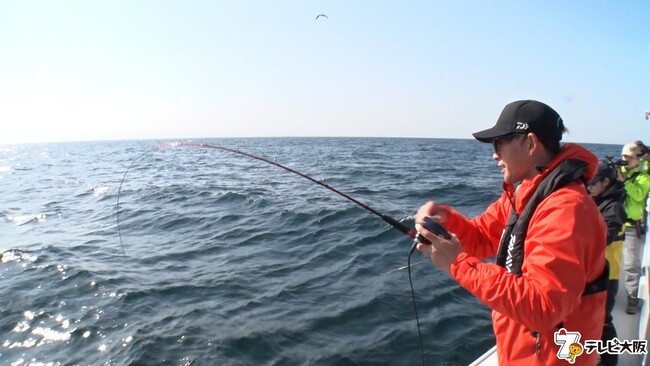 開始早々、畑口にヒット!釣り上げたのは、通常であれば良型とされる約25センチのアジ。続いて郷原もヒット!これまでにない引き。船上が緊張感に包まれる。大アジがと思われたが、なんと釣り上げたのはグッドサイズのイシダイ。うれしいゲストだが、今回の本命は大アジ。2人はその瞬間を待ち続け、ひたすら竿を振り続ける。