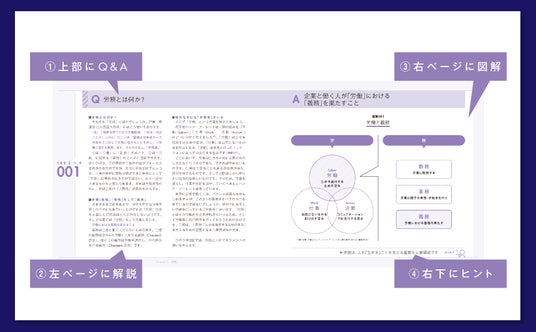 本書は、「100のツボ」という構造で、労務の基礎から実践までをわかりやすく解説しています。1つのツボは見開き1ページで完結しており、Q&A形式の解説、図解、実践のためのヒントが盛り込まれています。これにより、気になるポイントだけを「つまみ食い」することも、全体を通して労務の全貌を把握することも可能です。