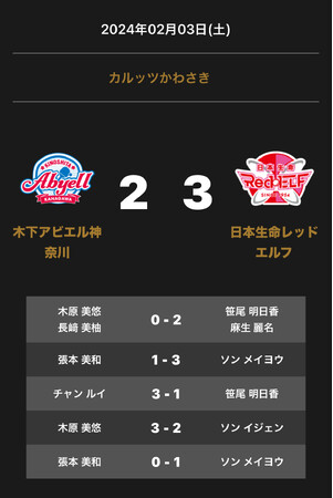 2024-02-03 一般社団法人Tリーグ ノジマTリーグ 2023-2024シーズン 公式戦 2月3日開催 木下アビエル神奈川 vs 日本生命レッドエルフ 試合結果 Tweet ノジマTリーグ 2023-2024シーズン 公式戦 2月3日開催 「木下アビエル神奈川 vs 日本生命レッドエルフ」の試合は、3-2で日本生命レッドエルフが勝利しました。 企業プレスリリース詳細へ PR TIMESトップへ 公式ツイッター Follow @Straightpress 最新情報をTwitterで受け取ろう! 公式フェイスブックページ 最新情報をFacebookで受け取ろう! 前の記事 一覧へ戻る 次の記事