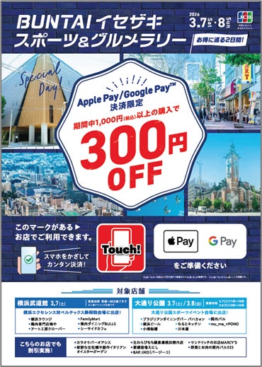 株式会社ジェーシービー (本社:東京都港区、代表取締役会長 兼 執行役員社長:二重 孝好、以下:JCB)は、2026年3月7日(土)、8日(日)の2日間、横浜大通り公園/伊勢佐木町エリアにおいて開催される「BUNTAIイセザキ スポーツ&グルメラリー」お得に巡る2日間!にあわせ、NFCタグ決済サービスを活用したキャンペーンを実施します。