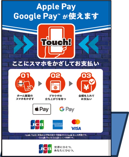 近距離無線通信技術(NFC:Near Field Communication)に対応した非接触型のICタグで、スマートフォンをかざすだけで情報を読み取ることができます。カメラを起動して焦点を合わせて読み取る操作を必要とするQRコードに比べ、NFCタグでは、「かざすだけ」という、より簡易な動作だけでサービス利用が可能になります。Apple PayおよびGoogle Pay(TM)に対応済みのカード会社発行のカードのみが利用可能となります。