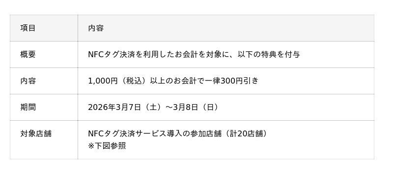 対象エリアには、臨時店舗やキッチンカーなどの非常設店舗も多く、従来の決済端末導入が難しいケースも存在します。そこで今回、省スペースかつ簡便に導入可能なNFCタグ決済サービスを活用し、イベントと連動したキャンペーンを実施します。