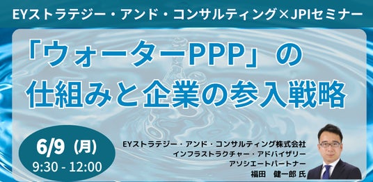JPI(日本計画研究所)は、EYストラテジー・アンド・コンサルティング株式会社 インフラストラクチャー・アドバイザリー アソシエートパートナー 福田 健一郎 氏を招聘し、ウォーターPPP」の仕組みと企業の参入戦略について詳説いただくセミナーを開催します。
