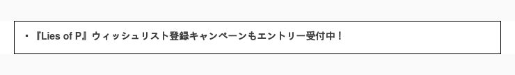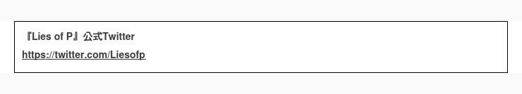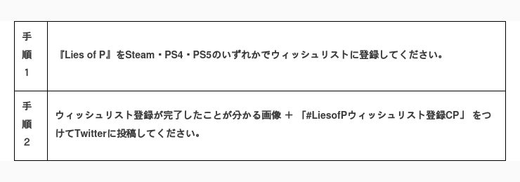 現在、ウィッシュリスト登録者数目標を達成する毎に、表示のノベルティ制作とプレゼントキャンペーンを展開する日本限定の企画“『Lies of P』ウィッシュリスト登録キャンペーン”もまだまだエントリー受付中です。