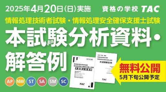 情報処理技術者試験、公認会計士、公務員、日商簿記検定、CompTIAなどの資格取得に向けた教育サービスを展開しているTAC株式会社(東京都千代田区、代表取締役社長:多田 敏男)は、4/20(日)に実施される令和7年度春期 情報処理技術者試験・情報処理安全確保支援士試験の解答速報を4/22(火)より順次TACホームページで公開いたします。