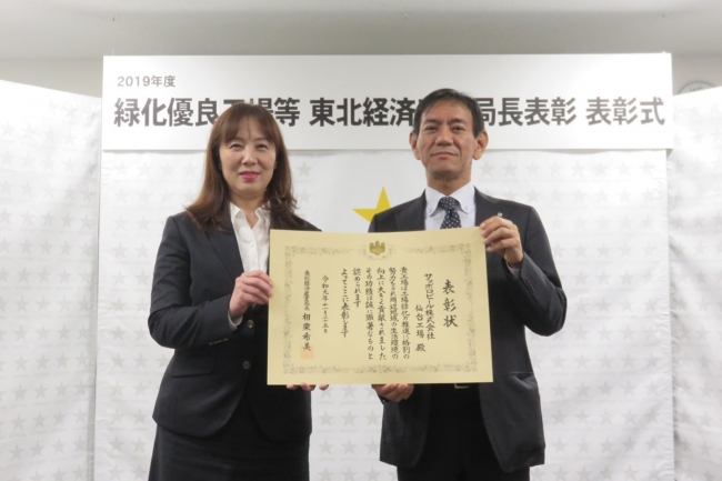佐藤工場長を始め、従業員の皆様が工場の緑化及び環境向上の取り組みを真摯に、そして継続的に行ってきた賜であります。引き続き、関係者一丸となって、今にもまして他の模範となっていただきたいと存じます。本日は誠におめでとうございます。