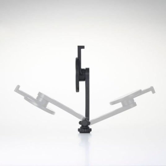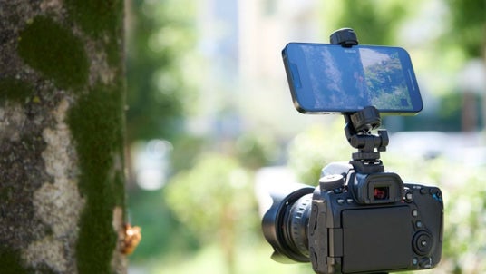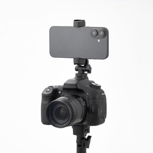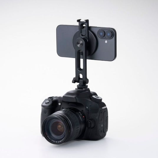- 一眼レフカメラ上部にあるアクセサリーシューに取り付け、ネジで締めて固定することが可能。一眼レフカメラで写真を撮りながら、同時にスマートフォンで動画の撮影ができます。