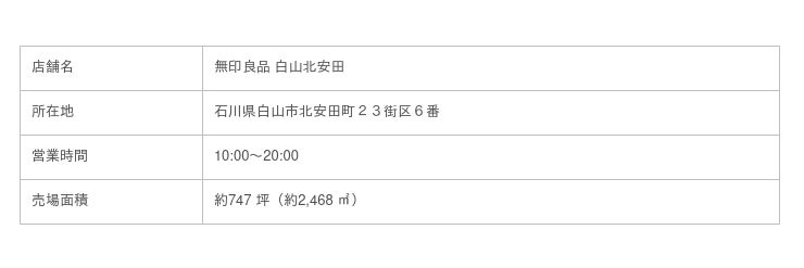 無印良品を展開する株式会社良品計画(東京都豊島区/代表取締役社⾧:堂前 宣夫)は、石川県白山市に「無印良品 白山北安田」(以下、当店)を12 月23 日(金)にオープンします。北陸地方で最大の売場面積となる当店は、日用品売り場を充実させ、近隣のお客様の毎日の生活を支える売場を目指します。また、中山間地域である白山市白峰地区への出張販売を行います。さらに、白峰地区周辺で買い物が困難な皆さまにも店舗へお越し頂けるように、12/22(木)のプレオープン※当日にはトライアルとして送迎バスを運行します。