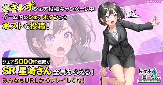 ゲーム開始後、プレイ中に表示されるポップアップまたは常設のシェアボタンより、Xにシェア投稿をすると、シェアの合計が5000件達成で全員にSR「星崎さん」をプレゼント!ぜひこの機会にシェア投稿のご協力をお願いします。