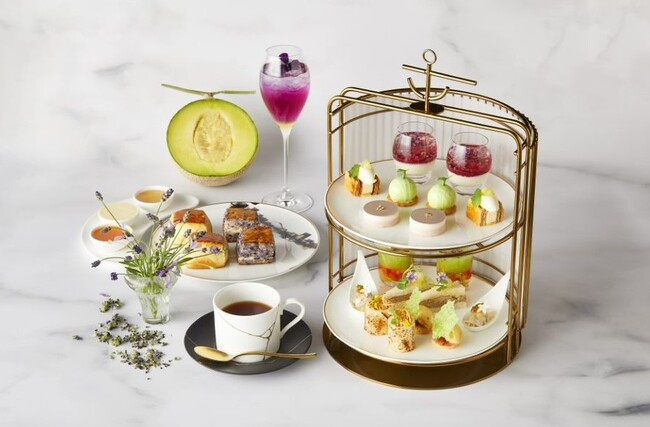 23階ロビーラウンジでは、贅沢な夏の風味をお楽しみいただけるアフタヌーンティーとして「ラベンダーとメロンのアフタヌーンティー」をご用意いたします。メロンでコーティングしたラベンダーと生ハムのムースを加えた「生ハムメロン」、「スモークサーモンと焼きパイナップルのロール ラベンダー味噌クリームチーズ」などのセイボリーアイテムや、「メロンとココナッツのミルフィーユ」や「ラベンダーとライチのケーキ ラズベリーソース」など、ラベンダーが引き立てるメロンの爽やかなエッセンスをお楽しみください。ウェルカムモクテルとして、ブルーベリーとラベンダーを紅茶で割った美しいパープルのドリンク「サマーラベンダー」をご用意しています。土日・祝日には「メロンとローズのソーダ」をお付けいたします。