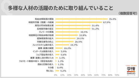 多様な人材の活躍のために取り組んでいることは、「有給休暇取得の奨励」76.4%が最多。次いで、「時間外労働(残業)の削減」67.9%、「男性の育休取得支援」51.4%、「長時間労働の是正」51.2%、「テレワークの実施」34.5%、「時間単位の有給休暇の取得」32.8%が続きました。